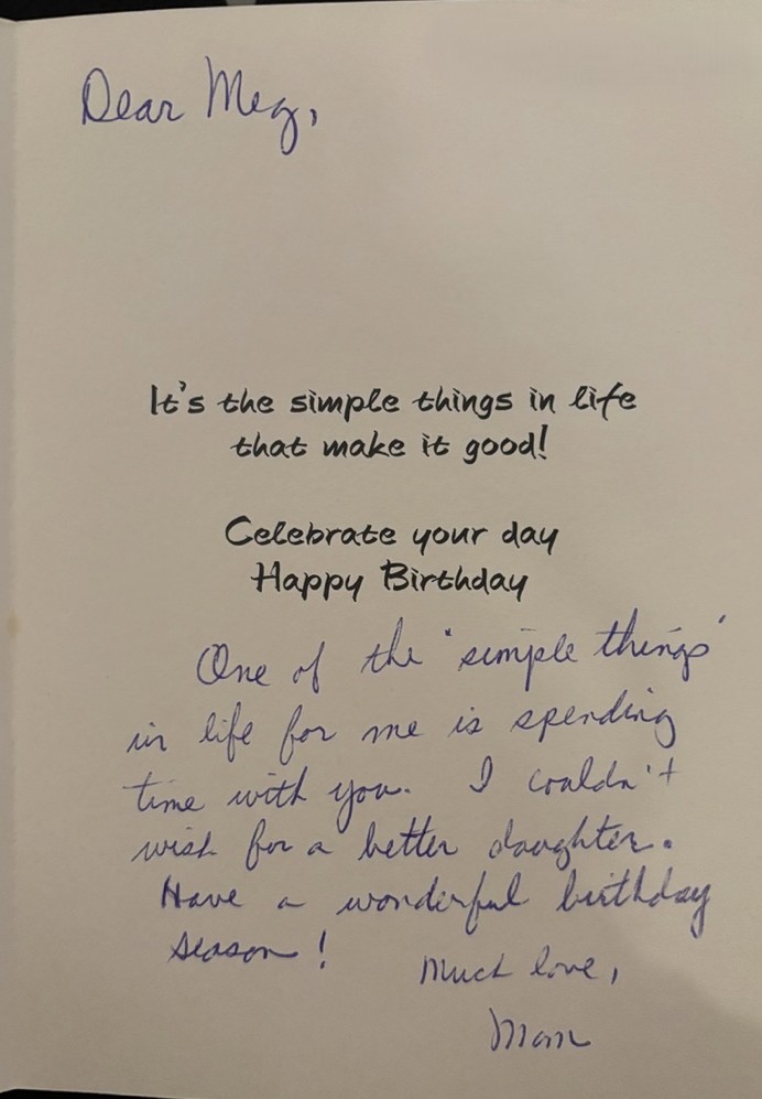 I think about all the ways I could have done better by her. I’d start by wiping the scowl off my face in her college graduation photos. I was in 11th grade and I couldn’t understand – not even close – what it took to finish college on the cusp of 50 with 3 kids and a household to run. I also think of her every time I unload the dishwasher. I wish I could tell her I am sorry for all the times I took a clean bowl out of the dishwasher and left the rest, as though I didn’t know who that chore would fall to. I could have done better. And also I was a kid and I own my selfishness and recognize that one of the blessings of a mom like mine is that she loved me even when I was at my worst. What I lost is the opportunity to tell her, “I got mine, mom. Ha ha! Karma is a bitch.” And then she’d smile and we’d laugh. Clearly from the birthday card pictured she only dwelled on the best in me – and we did have part of my adult life to enjoy each other’s company and make up for my teenage transgressions. We traveled around Europe together for two weeks when I was in my mid-20s and she told me she had to pinch herself that I wanted to spend so much time with “your dear old mom.” It was a gift, in both senses of the word. Sometimes I let myself dawdle at the precipice of imaginings about what the last 14 years could have been like for me and my kids, but that generally leads to a vice tightening sensation around my heart and lungs so I tamp it down. When did that kind of thinking ever lead anywhere good?