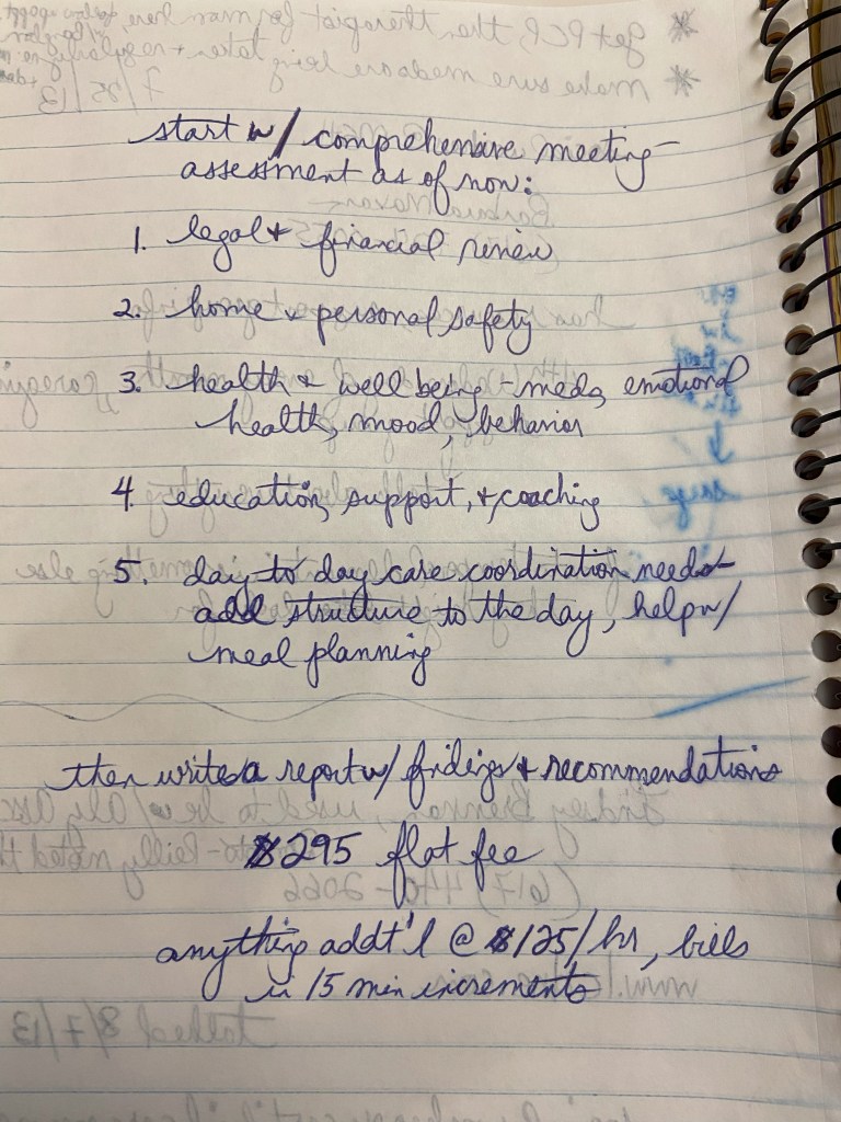 Geriatric Care Managers (GCMs, now sometimes called Aging Life Care Advisors) can be incredible partners to suss out your individual situation and figure out actionable next steps. But also can be quite expensive. To the right are my notes from interviewing a GCM for my mom back in 2013.